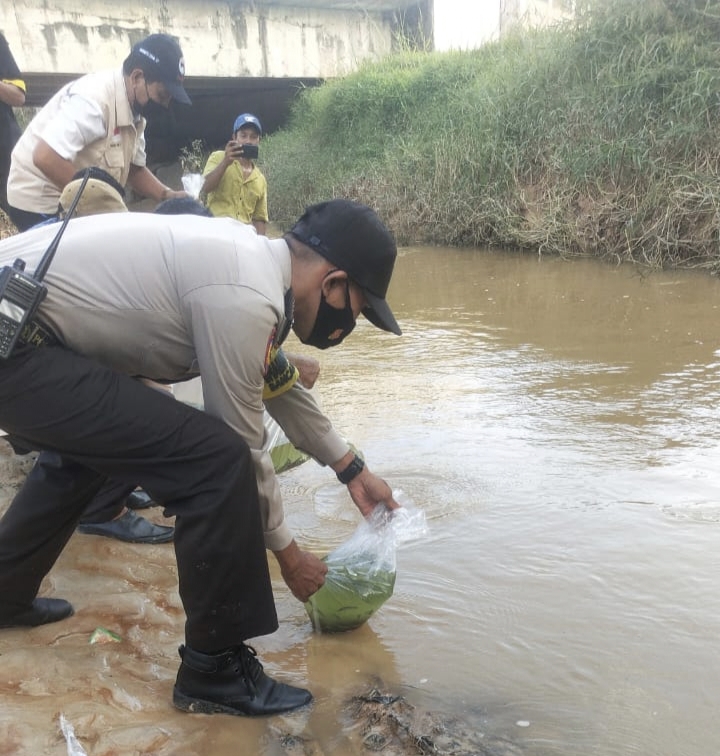 PEKANBARU, Saturealita.com-Untuk menjaga ekosistim perairan sungai, Dinas Kelautan Perikanan (DKP) Riau bersama pemuda peduli lingkungan RW 07 Kelurahan Bencah Lesung Kecamatan Tenayan Raya melakukan penaburan benih ikan di sepanjang sungai di wilayah tersebut.