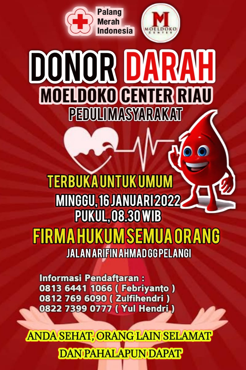 PEKANBARU, Saturealita.com-Dewan Pimpinan Daerah (DPD) MOELDOKO CENTER RIAU, berkerjasama dengan Palang Merah Indonesia (PMI) kota Pekanbaru, galang donor darah terbuka untuk umum, dalam kegiatan bakti sosial yang diselenggarakan Ahad, (16/1/2022) bertempat, Firman Hukum Semua Orang (FHSO) Jalan Arifin Ahmad Pekanbaru Gang Pelangi Pekanbaru.