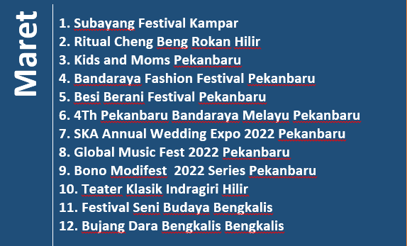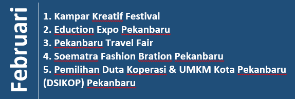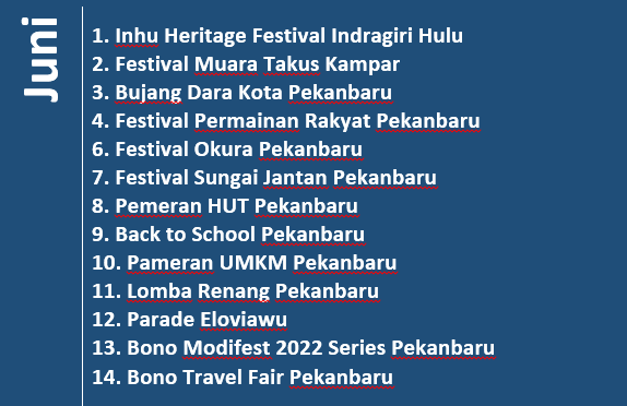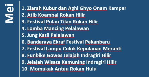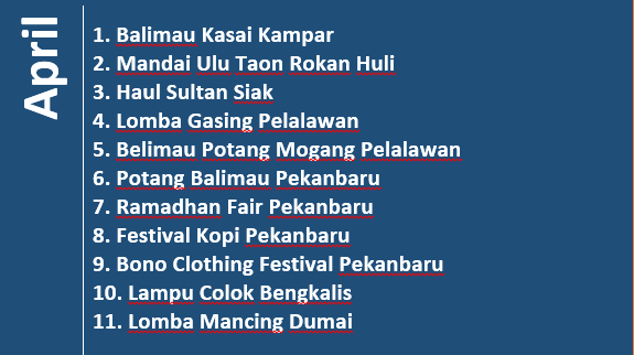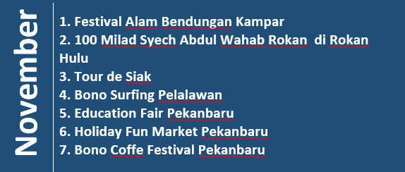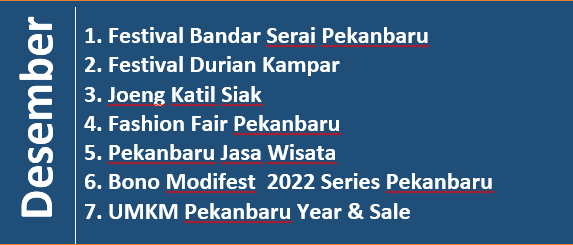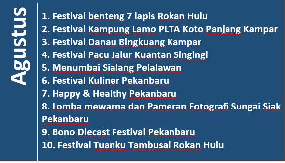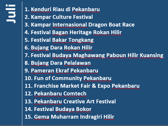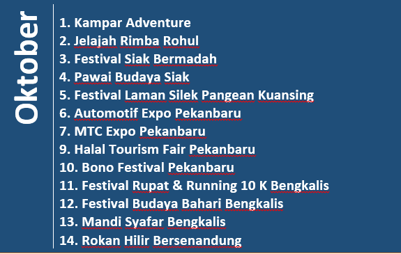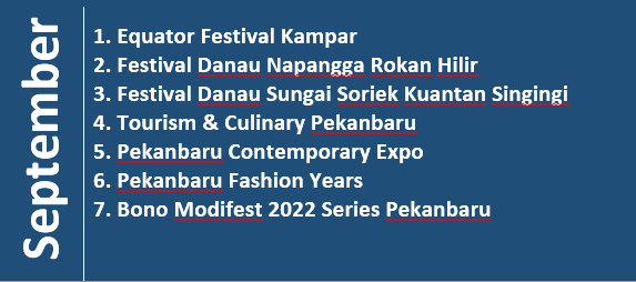 Selain itu, Calendar of Events Pariwisata Riau diharapkan mampu memberikan dampak positif terhadap ekonomi, sosial budaya, dan lingkungan dengan prinsip berkelanjutan.