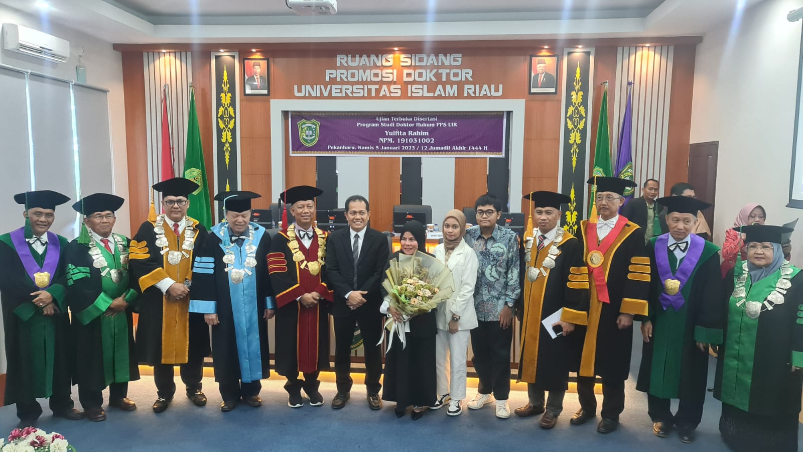 PEKANBARU,Saturealita.com-Notaris Yulfita Rahim SH MH berhasil mempertanggung jawabkan hasil penelitian dan disertasinya dihadapan Rektor Universitas Islam Riau dan delapan tim penguji pada Ujian Terbuka Disertasi Program Studi Doktor Hukum Program Pascasarjana Universitas Islam Riau yang berlangsung di Kampus UIR Jalan Kaharuddin Nasution 113 Pekanbaru pada Kamis pagi (05/01 2023). Ibu dari dua anak ini lulus dengan prestasi cumlaude IPK 3,90.