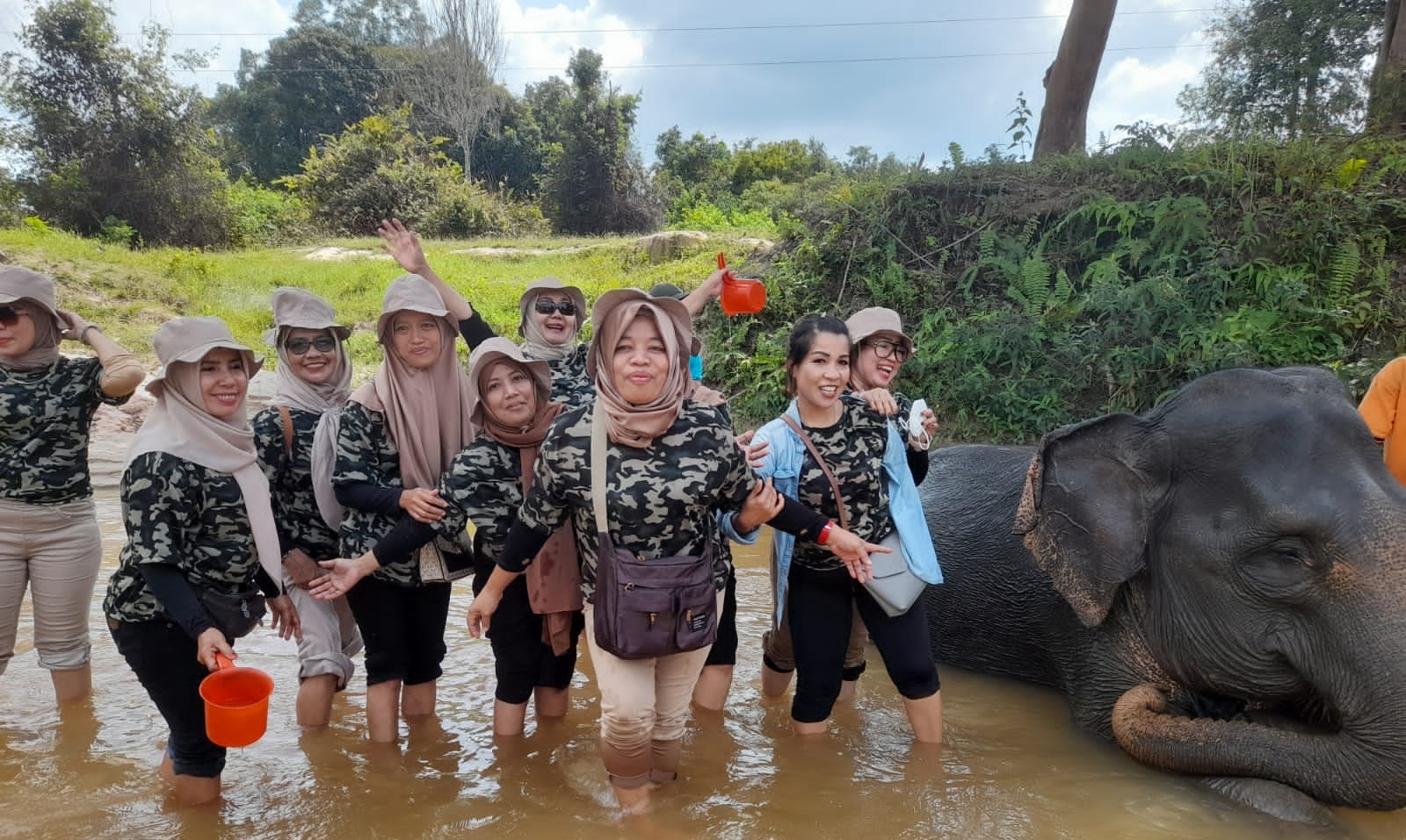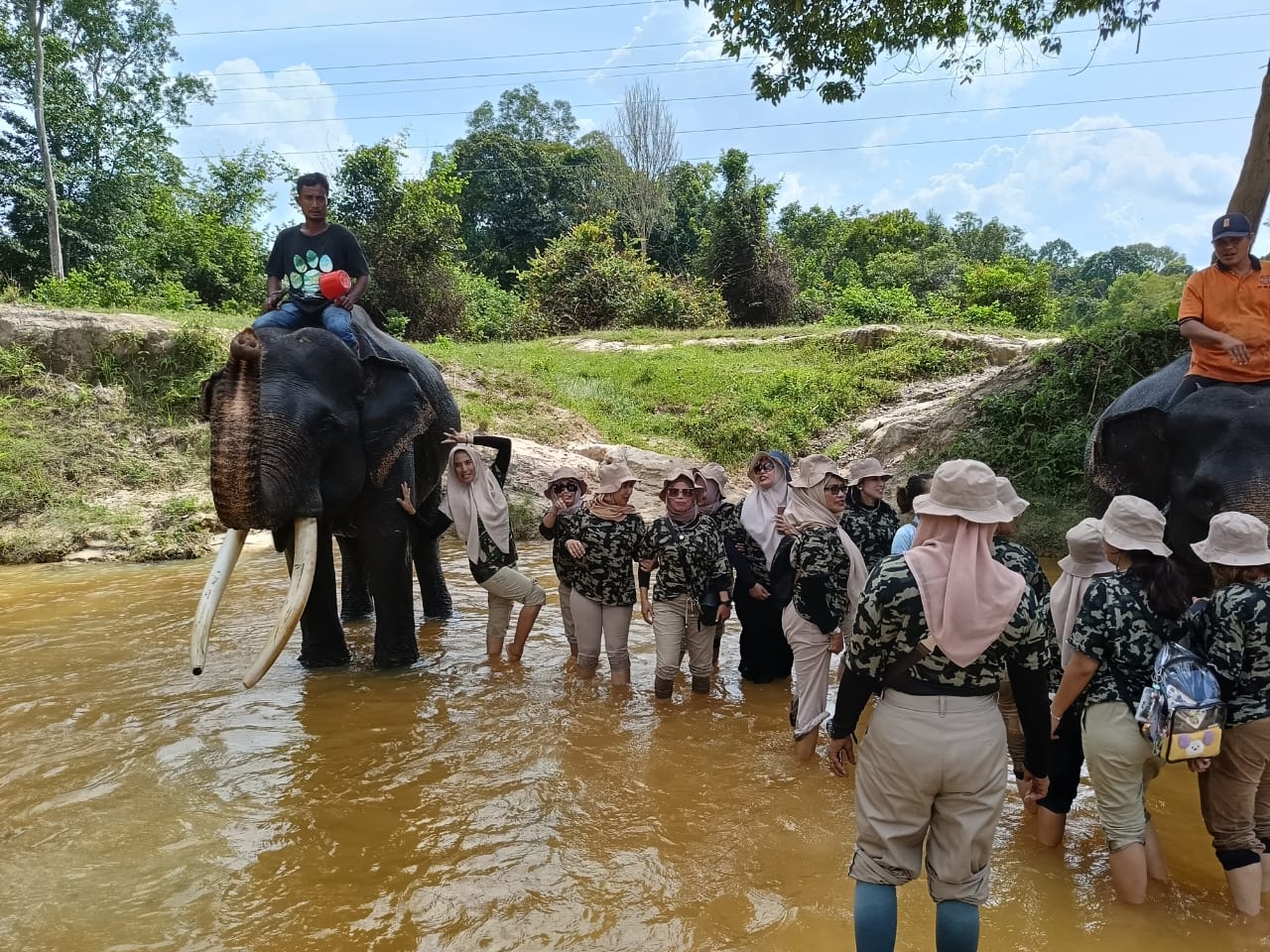 Petugas konservasi dan para pawang gajah menyambut kedatangan rombongan dengan ramah, ternyata sudah ada 2 ekor gajah bernama Bangki & Vera yang bersiap untuk berinteraksi dengan rombongan saat itu, tanpa membuang waktu para instruktur langsung bergelut di aliran anak sungai dengan sepasang gajah yang diperkirakan usia nya 35- 40 tahun, para instruktur diberi arahan dan pendampingan oleh pawang profesional bagaimana cara memandikan gajah sambil memberi kesempatan para instruktur untuk mengabadikan momen berharga tersebut melalui sesi foto-foto.