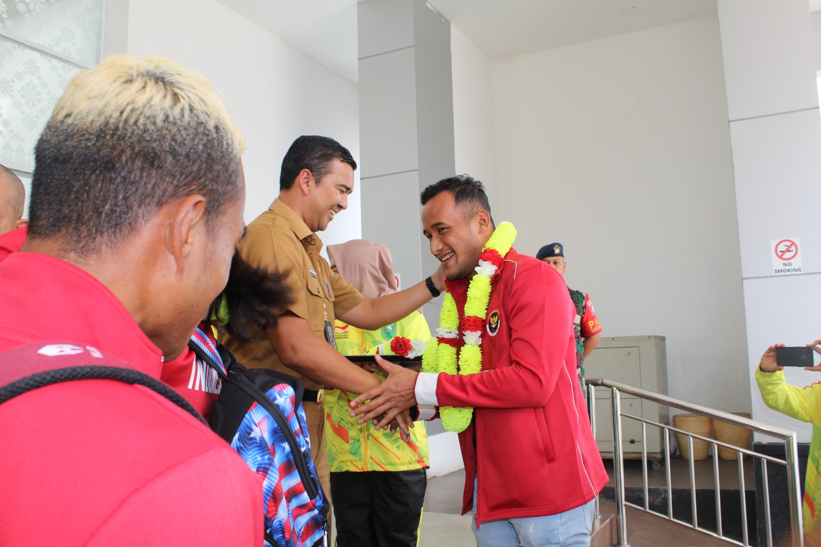 Suasana terlihat memecah, saat Kadispora Riau berkata, “Pak Jaya juga dikalungkan bunga, sontak terawa dengan canda bergulir”, kata Boby sambil menunggu dua atlet yang sedang dijemput.