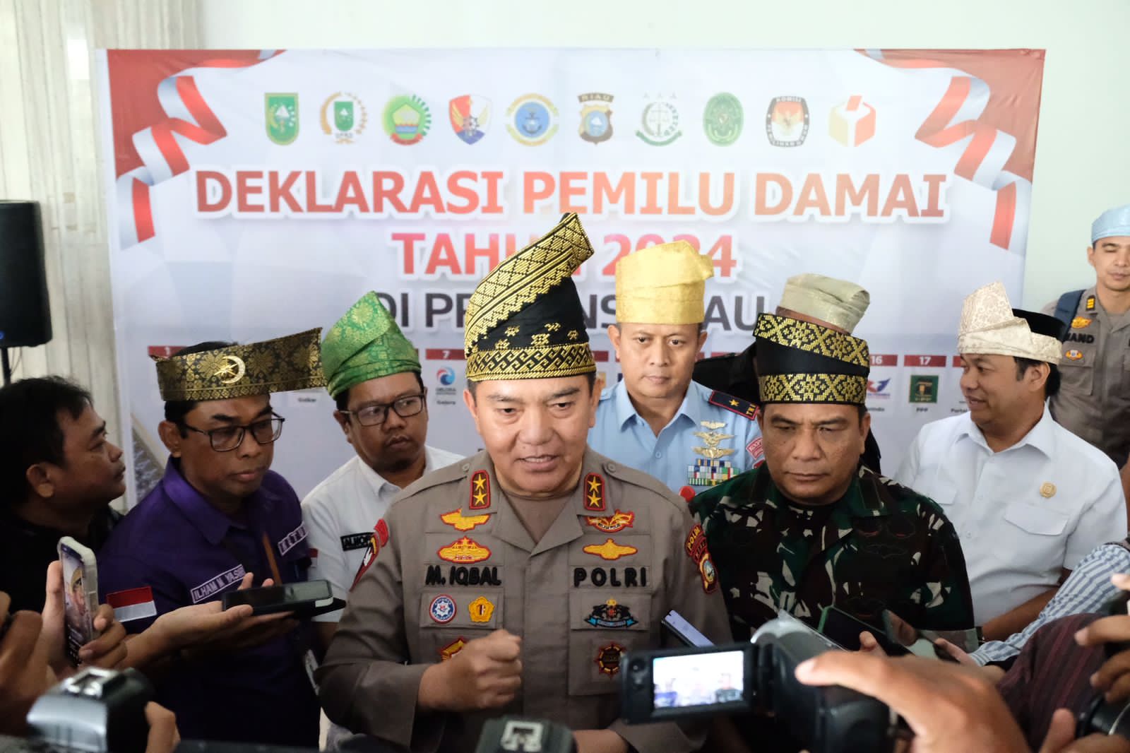 Sementara itu, deklarasi Pemilu damai tahun 2024 Provinsi Riau berisi terkait pelaksanaan pemilu damai dan kondusif mewujudkan demokrasi bermartabat serta mematuhi dan mentaati segala bentuk ketentuan yang berlaku, menyelesaikan berbagai permasalahan sesuai koridor hukum.