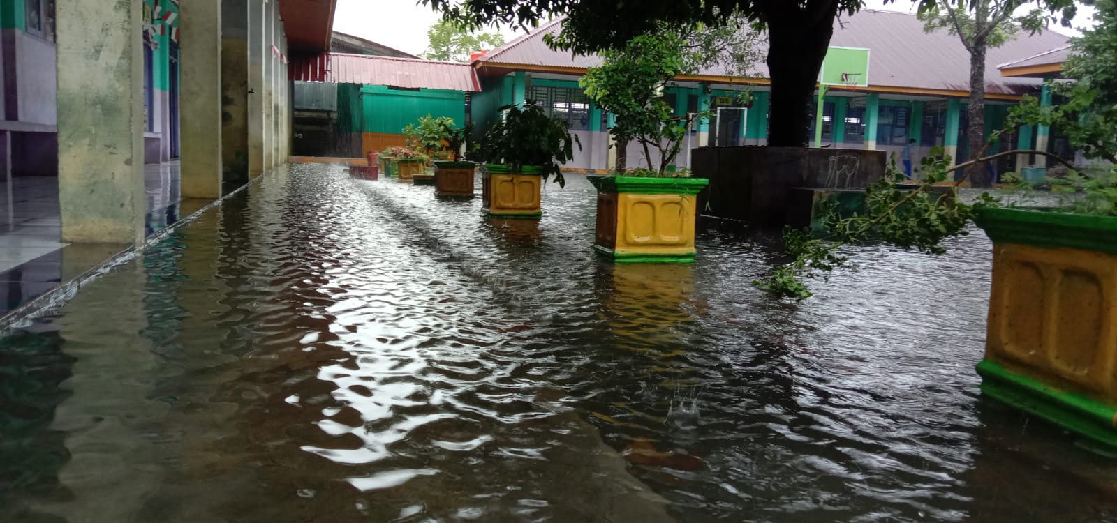 Ditempat lain seperti, fasilitas umum pendidikan misalanya, yang mempunyai dataran rendah tergenang air curah hujan yang saat ini, masih hujan disertai cuaca mendung.
