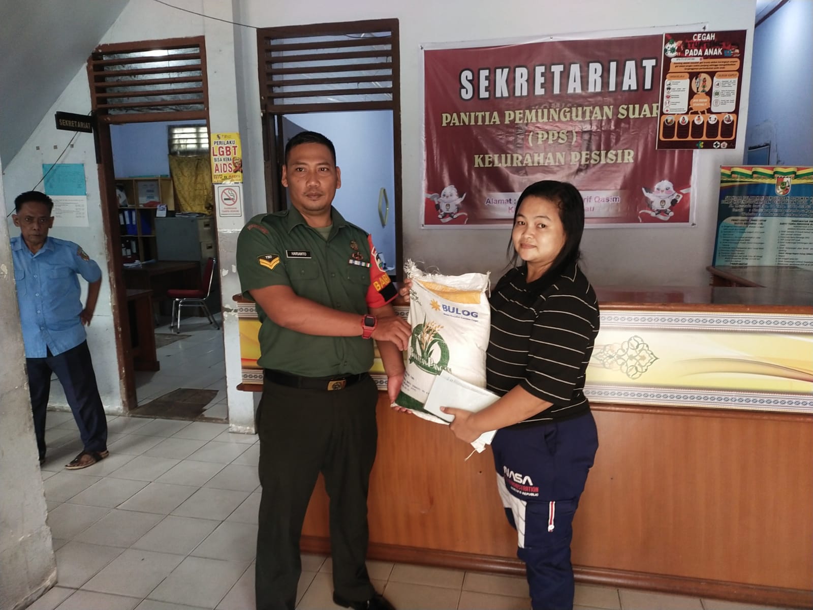 Giat Komsos pemberian bantuan beras dari Dinas Sosial dihadiri, Kasi Kesos Roni, Sekretaris Lurah (Seklur) Pesisir Yeni dan warga RT 01 RW 08 Sartika.