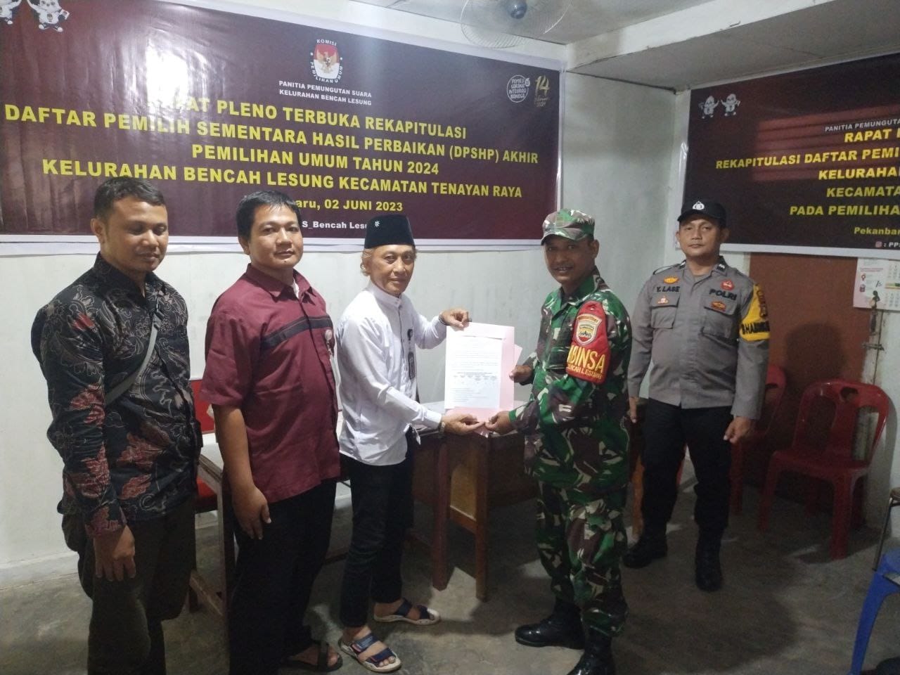 PEKANBARU (Saturealita.com)-Babinsa Kelurahan Bencah Lesung Sertu Ucok Parluhutan Koramil 04/Limapuluh Kodim 0301/Pekanbaru, menghadiri undangan Rapat Pleno Terbuka Rekapitulasi Daftar Pemilih Hasil Pemutakhiran (DPSHP) Pemilu 2024.