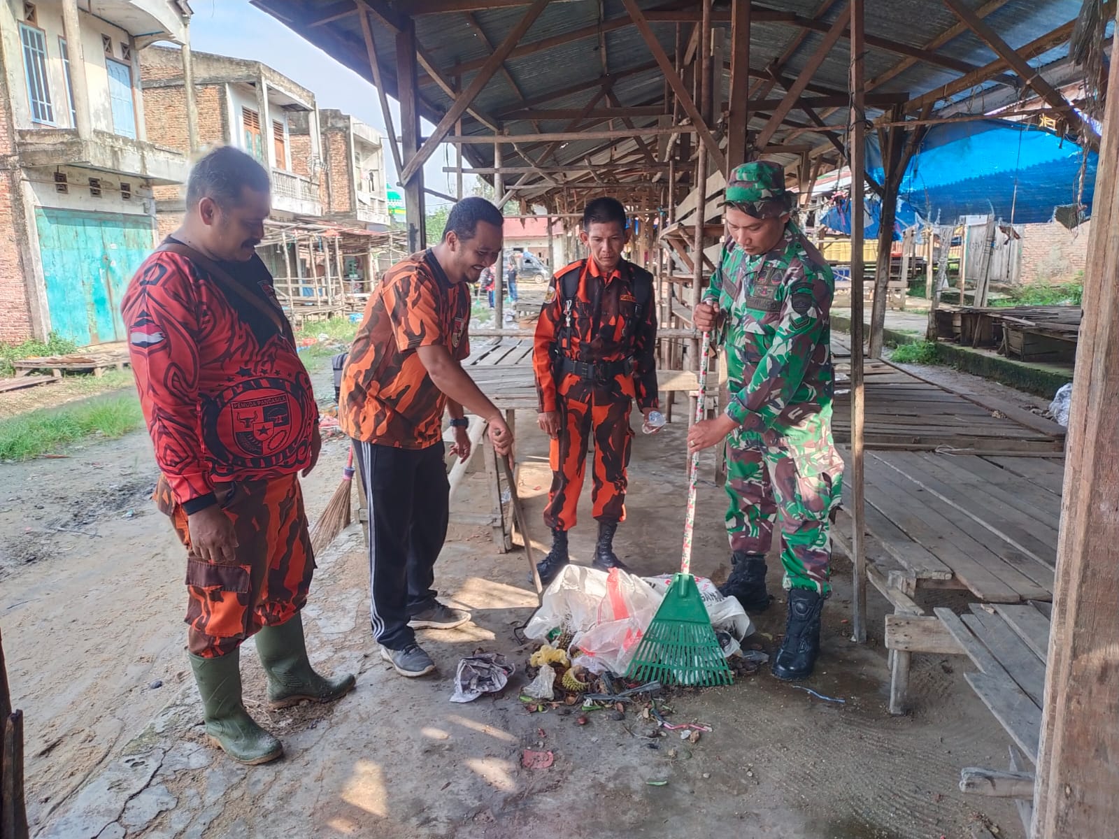 Babinsa Pesisir Koramil 04 Kodim 0301 Pekanbaru, Sertu Harianto bersama Ormas Pemuda Pancasila melaksanakan kegiatan gotong royong disepanjang Jalan Lintas Timur, tepatnya  diwilayah pasar Tangor Keurahan Mentangor kecamatan Kulim kota Pekanbaru, Senin (11/11/1023).
