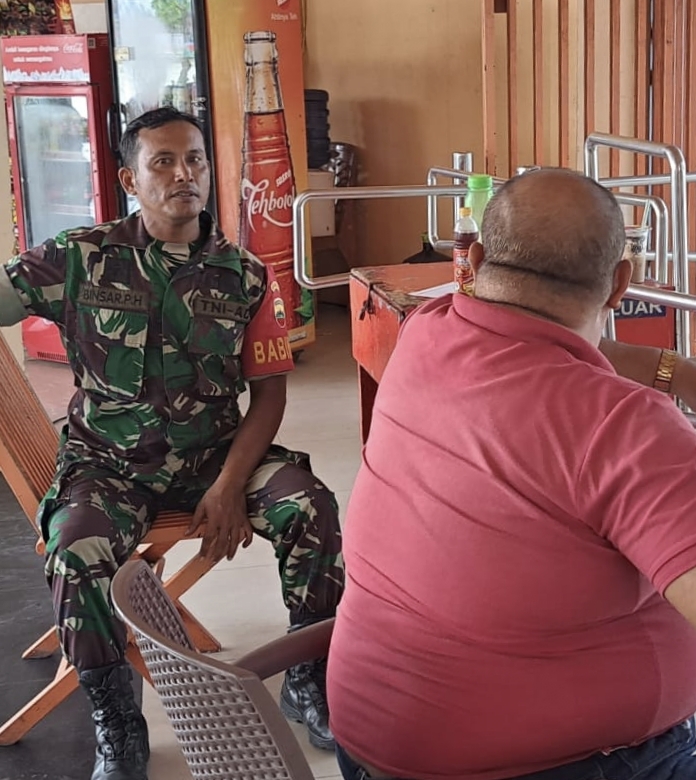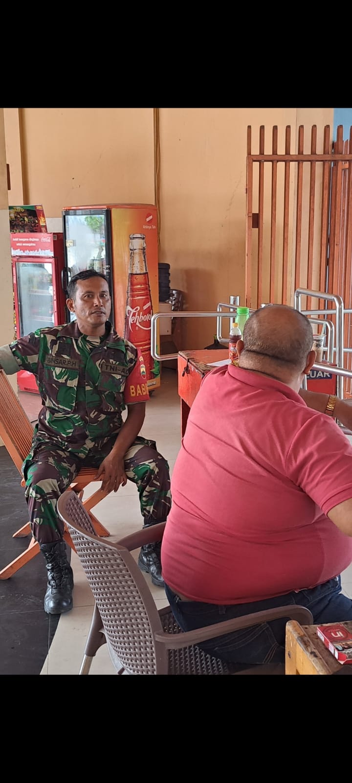 PEKANBARU (Saturealita.com)-Babinsa Koramil 04 Limapuluh Kodim 0301 Pekanbaru, Serda Binsar P melaksanakan kegiatan Komunikasi sosial (Komsos) dengan Lee Wan, pengelola kolam renang Kuantan Regency, Kelurahan Bambu Kuning Kecamatan Tenayan Raya Kota Pekanbaru, Selasa (19/12/2023).