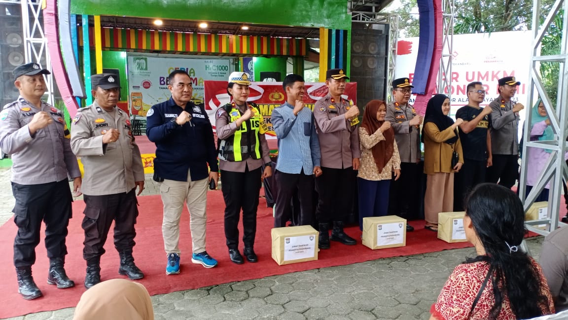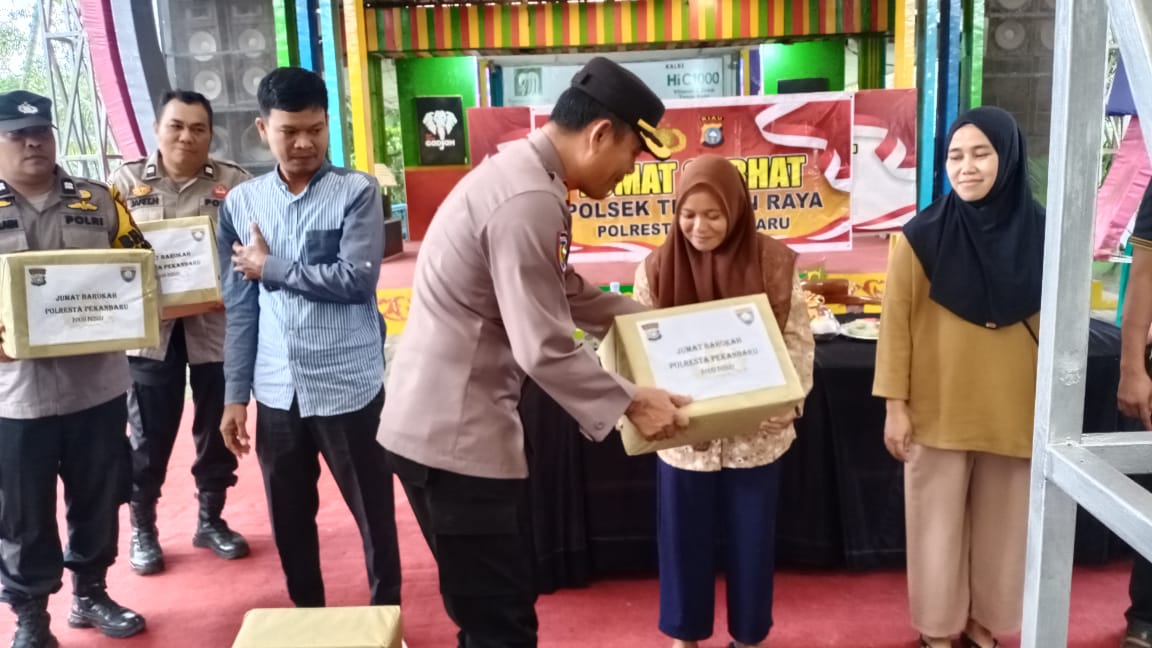 Selain kegiatan Jum’at Curhat, Polresta Pekanbaru dan Polsek Tenayan Raya, memberikan bantuan sembako kepada beberapa warga dengan paket sembako berisi beras, minyak goreng, gula, mie, teh, dan kopi.