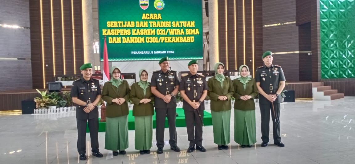 PEKANBARU (Saturealita.com)-Danrem 031/Wira Bima, Brigjen TNI Dany Racka Andalas awan S. A. P pimpin acara tradisi korps serah terima jabatan (Sertijab) Kasipers Kasrem 031/Wira Bima serta Dandim 0301/PBR, kegiatan tersebut dilaksanakan di Auditorium Kaharudin Nasution Korem 031/WB Jalan Mayor Ali Rasyid No. 1 Pekanbaru, Selasa (9/1/24).