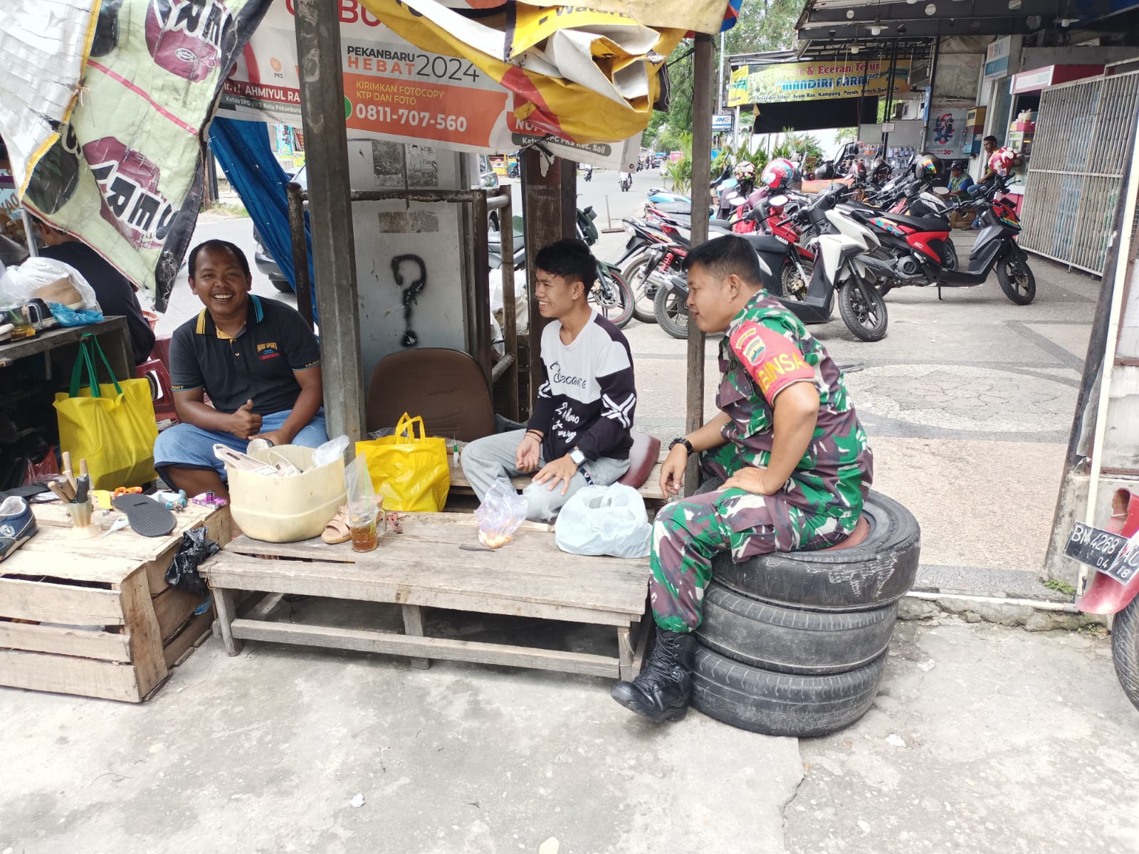 PEKANBARU (Saturealita.com)-Babinsa kelurahan Sekip Serda Satia Eka Putra komsos bersama warga RT. 03/05 yang sedang beraktifitas jualan kaki lima di pinggiran jalan Hangtuah kelurahan Sekip kecamatan Lima Puluh Kota Pekanbaru.