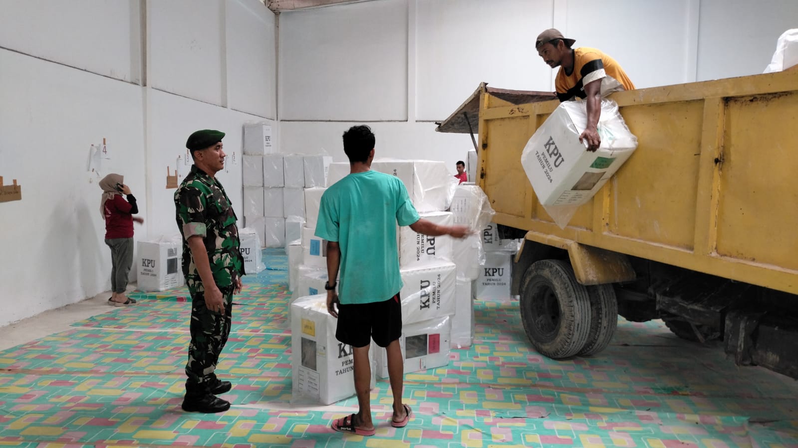 “Saya katakan, logistik Pemilu yang diangkut berupa kontak suara sebanyak 440 dan Bilik Suara 352 buah dengan Tim pengamanan dari, Polresta sebanyak tujuh orang anggota, Satpol PP, tiga orang, KPU 5 orang dan PPS tiga orang”, jelasnya.
