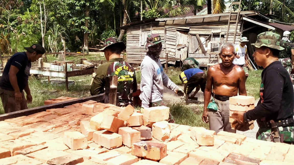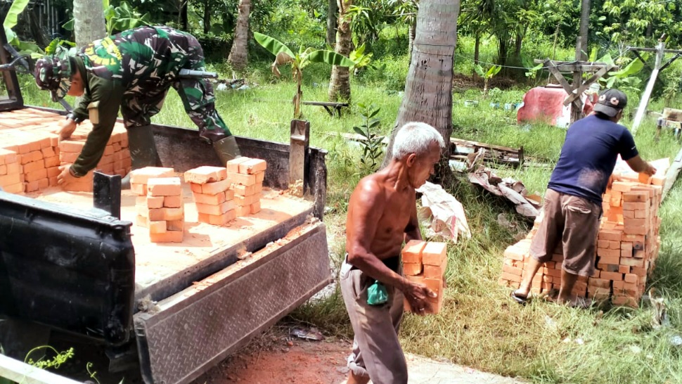 Sedikit demi sedikit batu bata dipindahkan oleh anggota satgas dan warga, agar pelaksanaan kegiatan pemasangan bata untuk dinding rehab RTLH milik salah satu warga.
