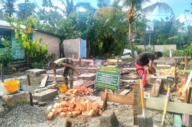 PEKANBARU (saturealita.com)- Pembangunan rehab RTLH pada program Tentara Manunggal Membangun Desa (TMMD) ke 120 Kodim 0301 PBR sudah memasuki hari ke 9 rehab Rumah Tidak Layak Huni (RTLH) milik Bapak Irman, Ibu Desmiyantri, Ibu Emi Fitri, Bapak Nasrizal dan Ibu Nurhayati, Kelurahan Meranti Pandak, Kecamatan Rumbai, Kota Pekanbaru, Selasa (30/04/2024).