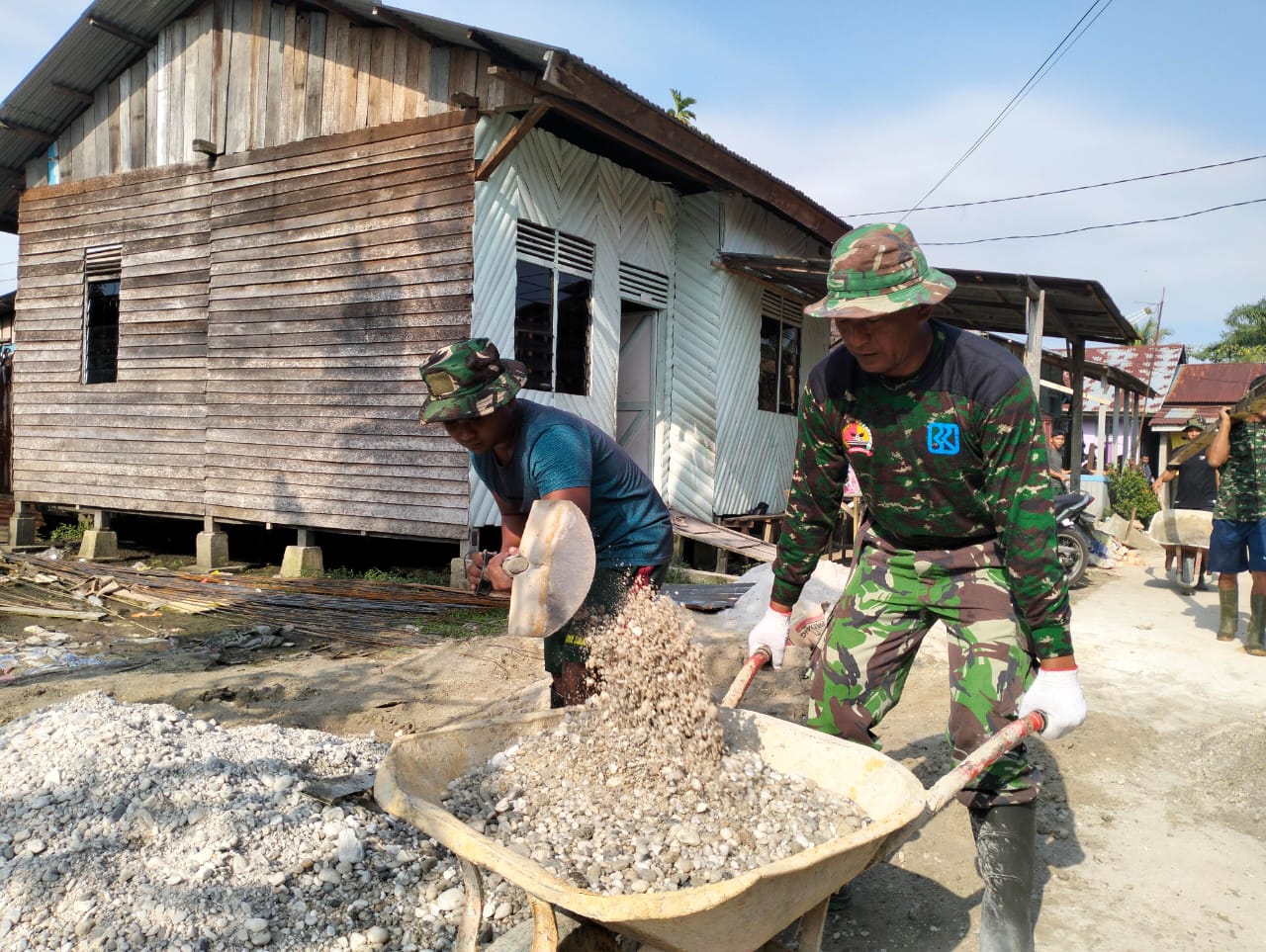 PEKANBARU (satureslita.com)-Tiga Matra, TNI, Polri dan Masyarakat saling bahu membahu membangun rumah layak huni. Pratu Dio Gones F. Nainggolan Koramil 07/Tenayan Raya membantu giat TMMD yang di laksanakan, bertemput Jalan Pesisir kelurahan Meranti, Pandak Kelurahan Rumbai, Jumat (10/5/2024).