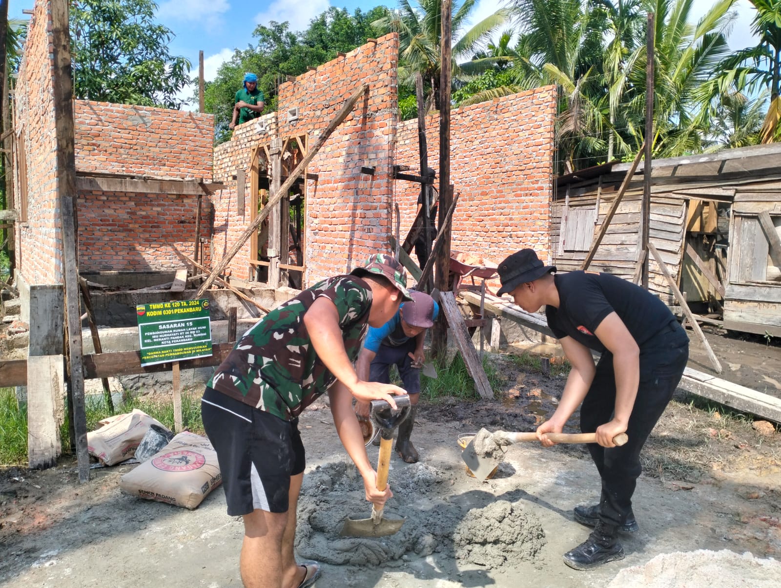 PEKANBARU (satureslita.com)-Tiga Matra, TNI, Polri dan Masyarakat saling bahu membahu membangun rumah layak huni. Sertu M. Isak Koramil 04/Limapuluh, membantu giat TMMD yang di laksanakan, bertemput Jalan Pesisir kelurahan Meranti, Pandak Kelurahan Rumbai, Jumat (10/5/2024).