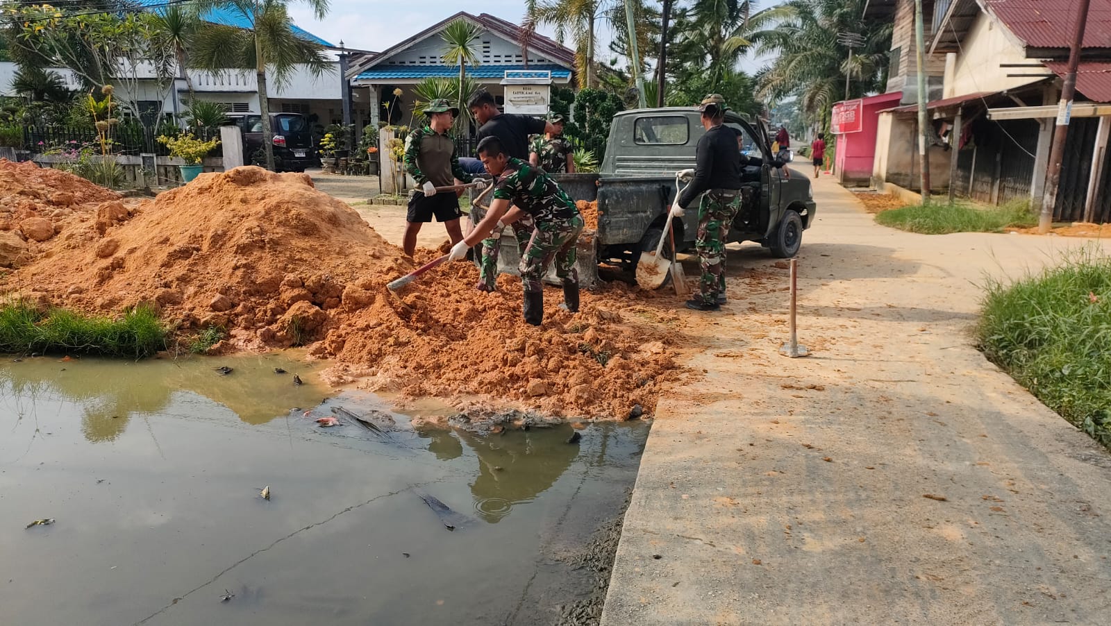 Dalam pekerjaan tersebut, Babinsa 04/Limapuluh Kodim 0301 Pekanbaru, Serda Ponco bersmaa tim Satgas lainnya melakukan penimbunan.