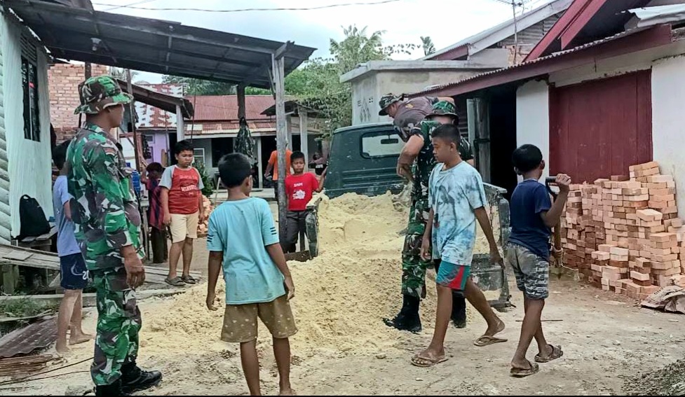 Disana sejumlah anggota satgas melakukan tugasnya bersama masyarakat melanjutkan pekerjaan yang belum terselesaikan, tapi justru menjadi hiburan tersendiri bagi anak-anak wilayah setempat.