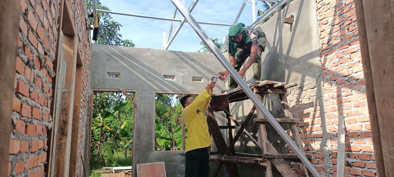 Salah satu anggota tim Satgas RTLH TMMD ke-120 Kodim 0301 Pekanbaru tahun 2024, Serda Eka ikut serta bekerja membantu percepatan pembangunan dengan sasaran pemelastersan bagian luar mapun dalam pada RTLH yang sudah kokoh dibangun.