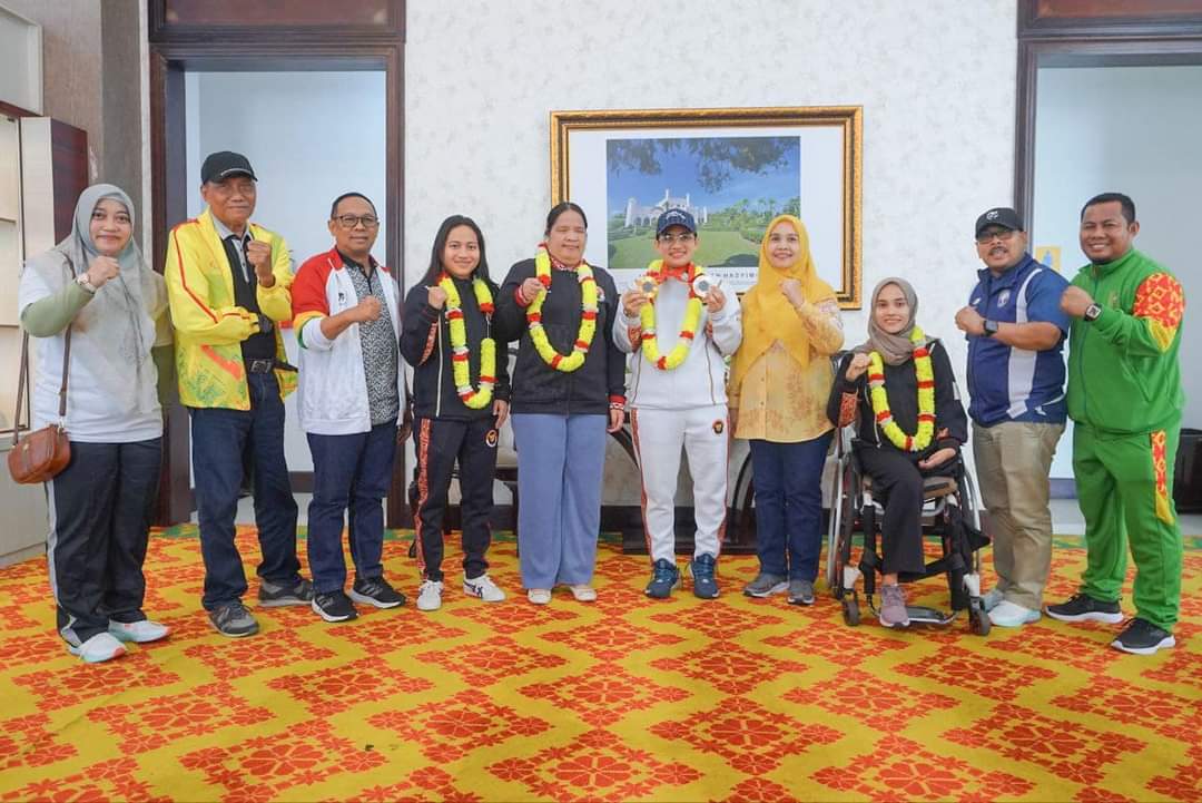 PEKANBARU (saturealita.com) – Didampingi Ketua National Paralympic Committee (NPC) Riau Jaya Kusuma, Penjabat (Pj) Gubernur Riau (Gubri) Rahman Hadi secara langsung menyambut kedatangan atlet Parabulutangkis asal Riau peraih medali emas ganda campuran bulutangkis diajang Paralimpiade Paris 2024, Leani Ratri Oktila begitu nama lengkapnya, kegiatan, Sabtu (14/9/2024) bertempat VIP Lancang Kuning Bandara Internasional Sultan Syarif Kasim II, Kota Pekanbaru Provinsi Riau.