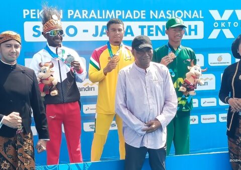 KARANGANYER,saturealita.com-Saat Tangisan haru Ketua National Paralympic Committee Indonesia (NPCI) Riau Jaya Kusuma pecah saat mengalungi medali emas.