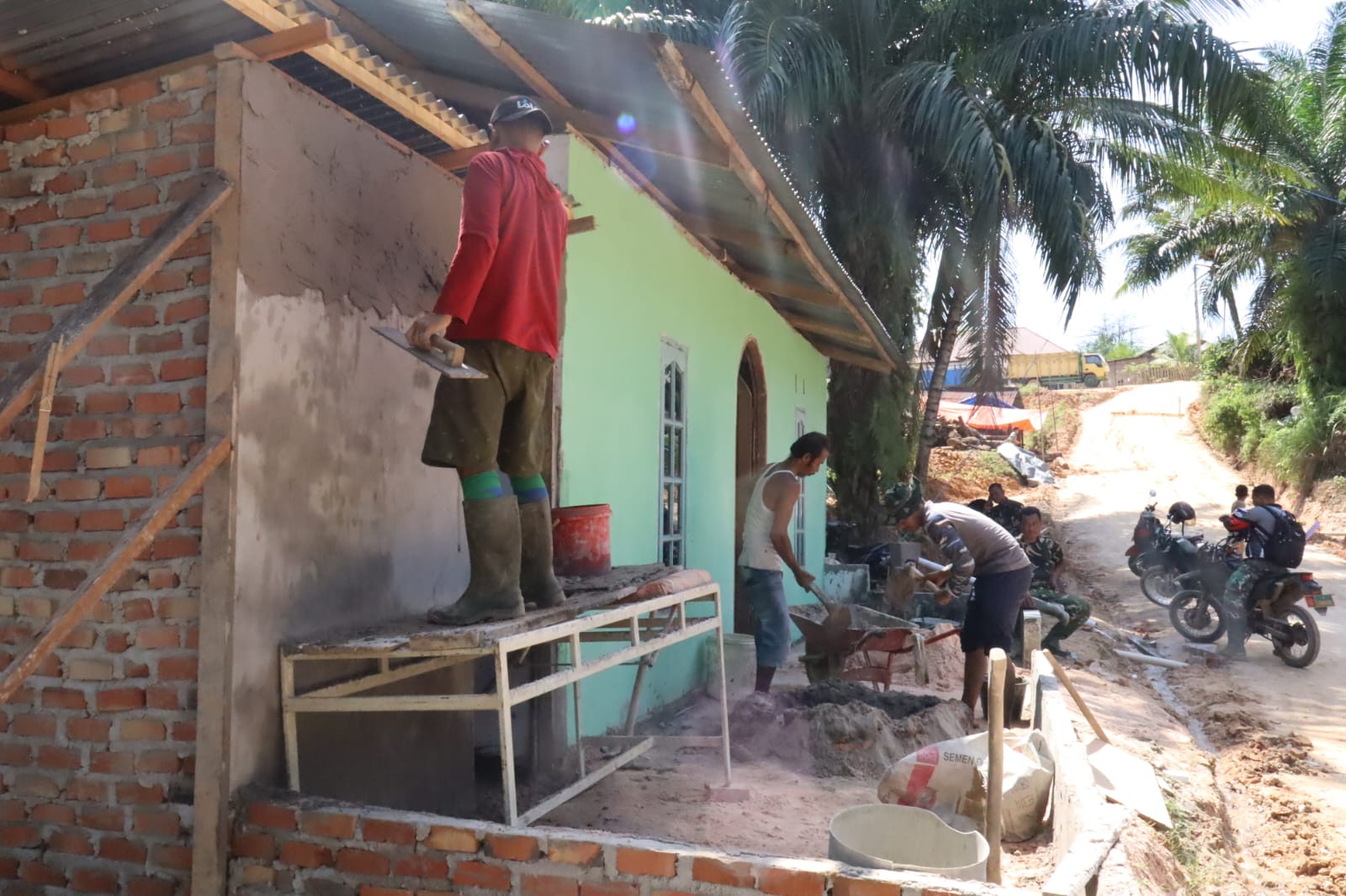 Meski berpuasa, para prajurit tetap bekerja dengan penuh keikhlasan menggesa pembangunan MCK Posyandu Kasih Ibu melalui pengerjaan plester dinding, bertempat di Jalan Mushola RT 03 RW 04, Kelurahan Tuah Negeri, Kecamatan Tenayan Raya, Kota Pekanbaru, Minggu (22/2/2026).